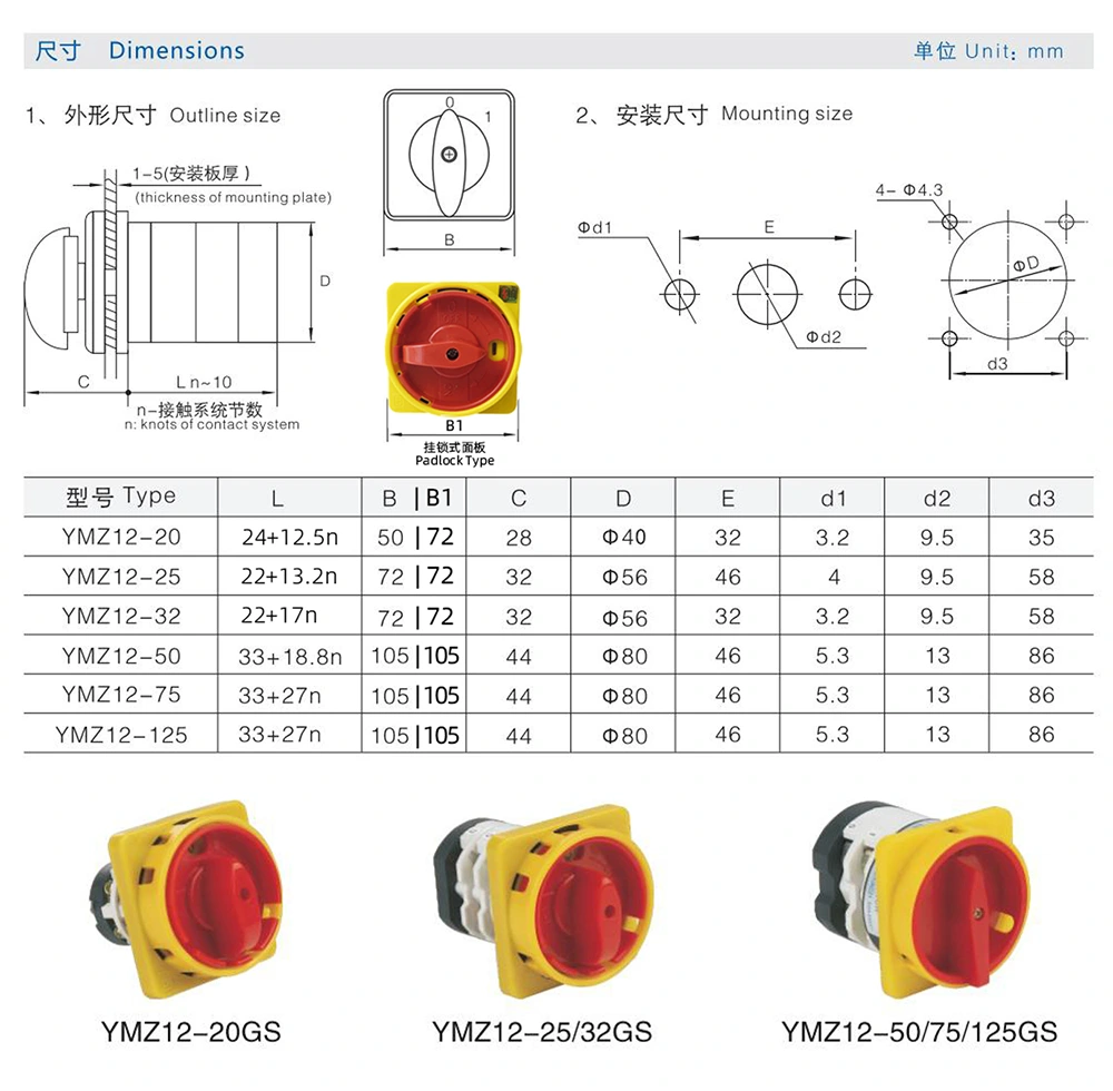 Con oltre 30 anni di esperienza professionale, Zhejiang Yaming Electric è un fornitore leader di interruttori elettrici di alta qualità. Sfruttando una forte forza tecnica e un sistema completo di gestione della qualità, siamo lieti di presentare il nostro interruttore a camma rotante con combinazione a due posizioni OFF-ON con lucchetto da 50 A (codice interno: YMZ12-50GS). Caratterizzato da squisita fattura e tecnologia avanzata, è dotato di funzionalità anti-malfunzionamento per garantire un controllo del circuito stabile ed efficiente per gli utenti industriali globali.